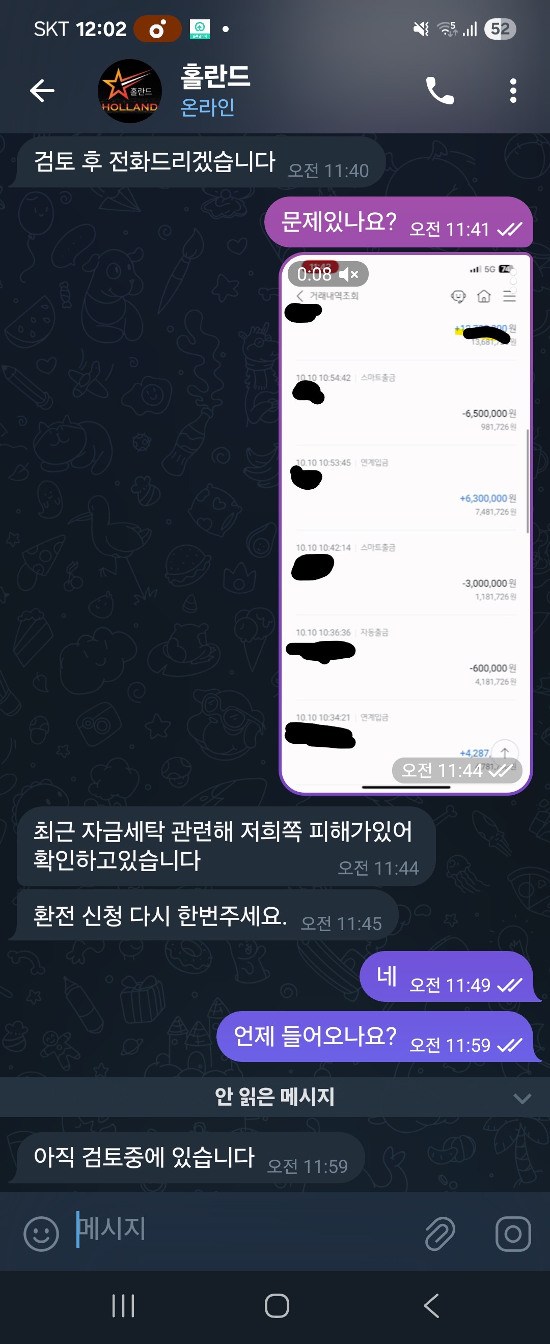 환누르니 텔레그램오더니 계좌입금한거 인증하라하고 무슨 자금세탁 때문에 확인해야 한다더니