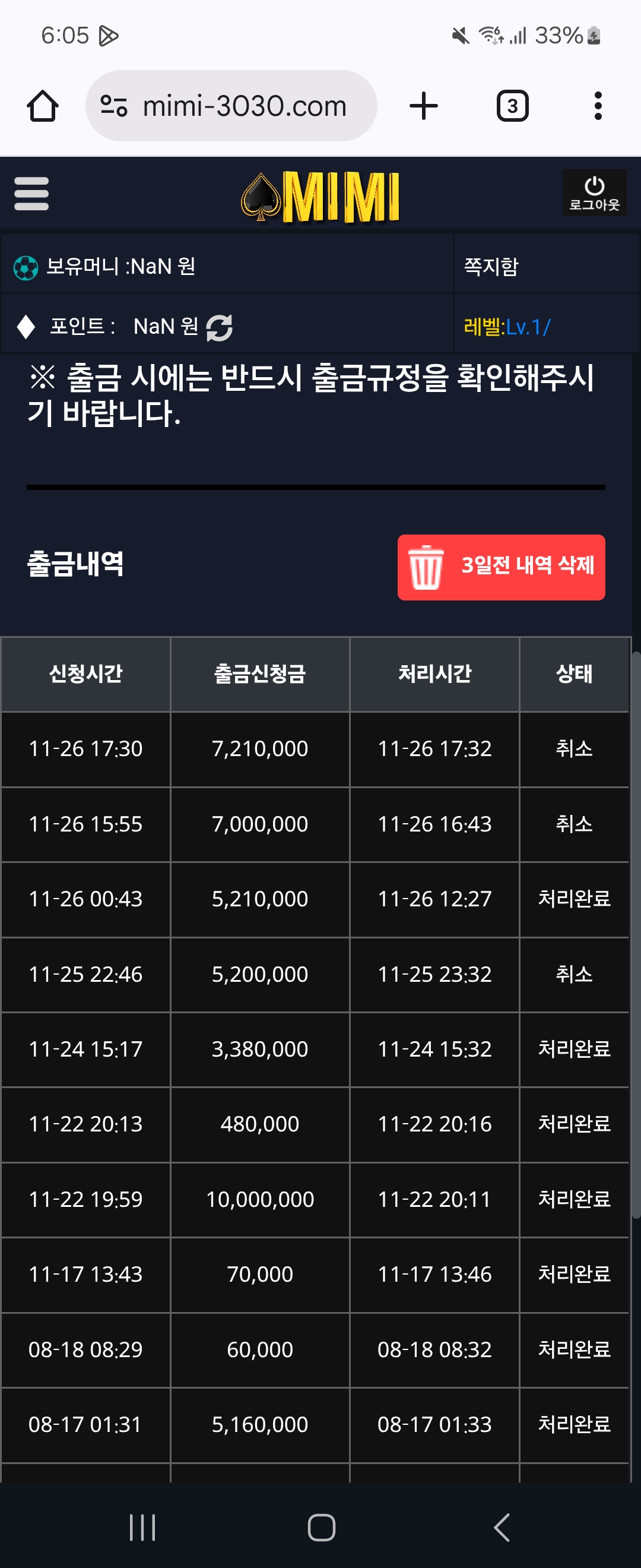 남은 보유잔액 마저도 NaN 으로 변경되어있고 출금 목록을 확인을 해보니 취소처리가 되어있어서 문의를 넣을려고 고객센터를 들어갔더니